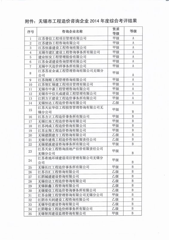 我公司在无锡市工程造价咨询企业2014年度综合考评中荣获等级A