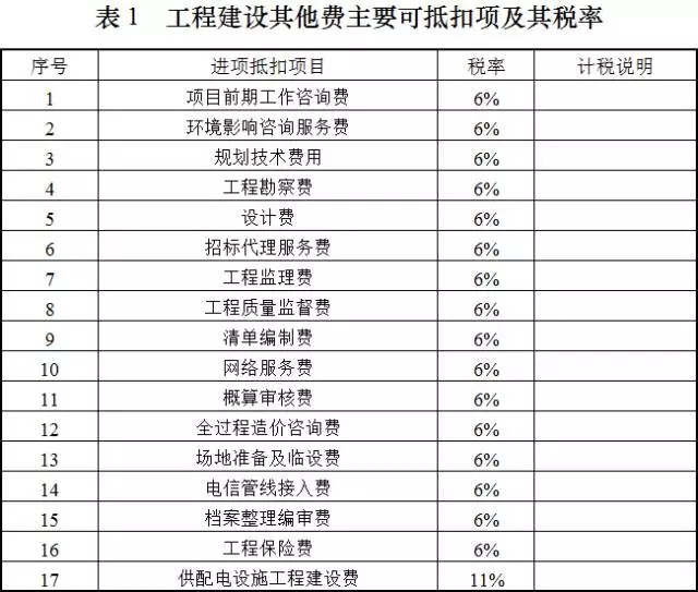 二、工程建设其他费可抵扣进项税核算工程建设其他费包括项目前期工作咨询费、环境影响咨询服务费、规划技术费用、工程勘察费、设计费、招标代理服务费等等,其主要可抵扣项及其税率参见下表: