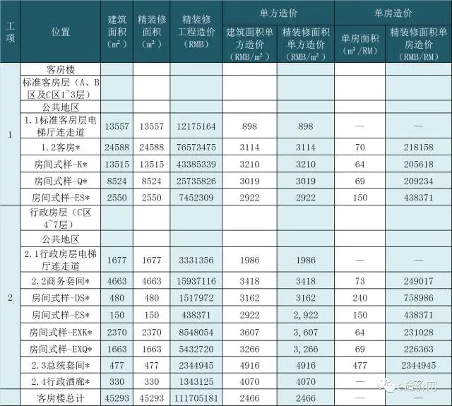以某五星级度假酒店精装修专业的结算后评估报告为例,该报告包含了项目概况、精装修工程造价指标、精装修工程范围、客房层造价估算明细、标准客房造价估算明细、装饰材料表以及平面图等内容,由于篇幅所限,以下提供精装修工程造价指标表供参考,见表4。