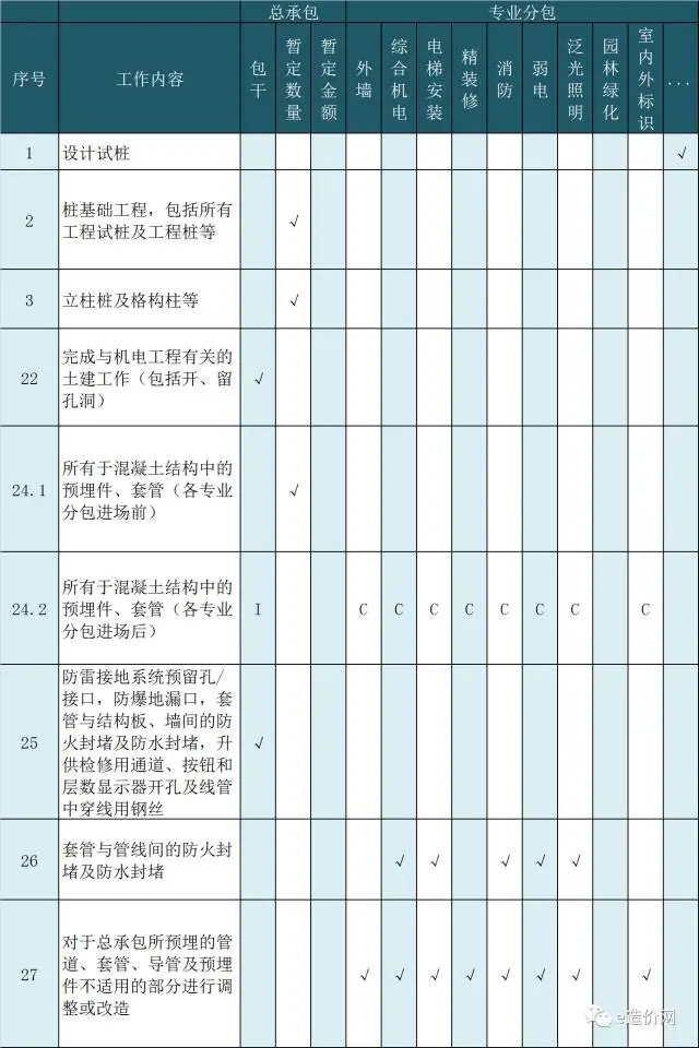 ①施工界面表。“施工界面表”是合同中重要的管理性文件。施工界面表的编制需在总承包工程招标前完成,它罗列了整个项目拟发包的所有合同标段,以及为完成整个项目所需的所有几百乃至上千条工作内容,其作用包括如下: